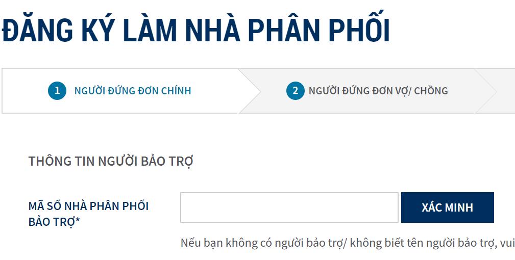 9. Điền mã số nhà phân phối bảo trợ (liên hệ NPP bảo trợ) và bấm nút XÁC MINH. Bạn cần kiểm tra lại thông tin họ tên người bảo trợ, rồi bấm nút TIẾP TỤC.