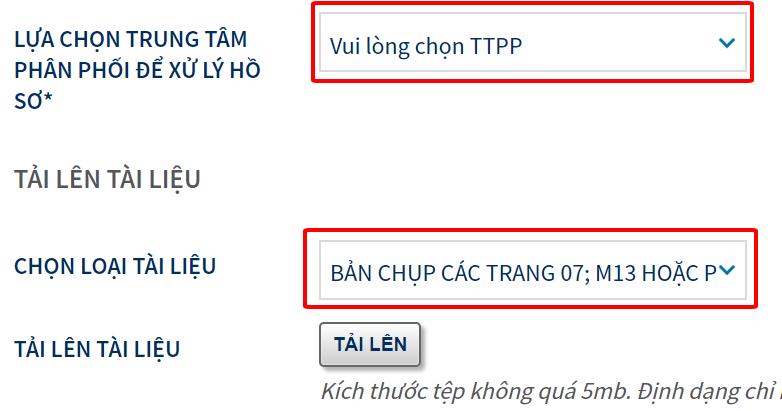 11. Nhập thông tin tài khoản ngân hàng, chọn nơi nộp hồ sơ và chọn loại tài liệu tải lên –> Tải lên trang 7 và form M13 đã ký (mua Form từ cty Amway)